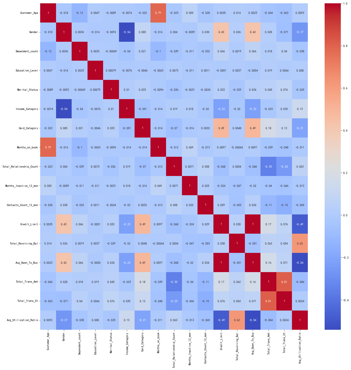 相关性绝对值大于0.8的特征: [('Credit_Limit', 'Avg_Open_To_Buy'), ('Total_Trans_Amt', 'Total_Trans_Ct')]