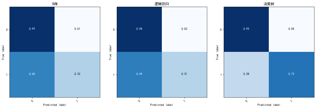 cm_dt, classes=["0", "1"], normalize=True, title="决策树", colorbar=False